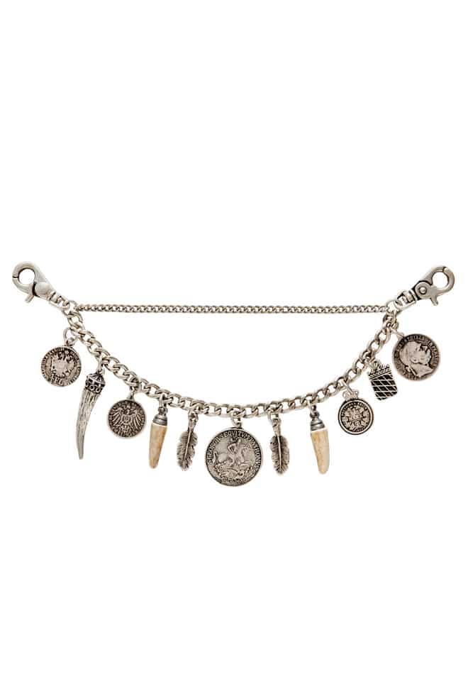 Das hochwertige Charivari besteht aus zwei Ketten. An beiden Seiten garantieren Schnappringe eine leichte Befestigung an den Gürtelschlaufen oder den Knöpfen für die Hosenträger. Die obere Kette ist etwas zarter gehalten, die untere massiver, denn sie hat die reichhaltige Zier zu tragen. Mittig ist eine große Münze, rechts und links davon sind zwei in Zierrand gefasste kleinere angebracht. Weitere Trophäenahänger machen jede Kette geradzu einzigartig.