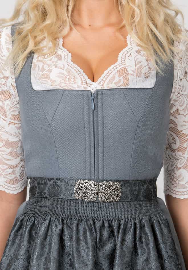 • Schürze: Auffällige, farblich abgestimmte Jacquard-Schürze mit verzierter Schließe in Altsilber – stilvoller Blickfang