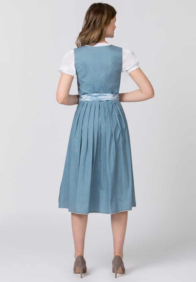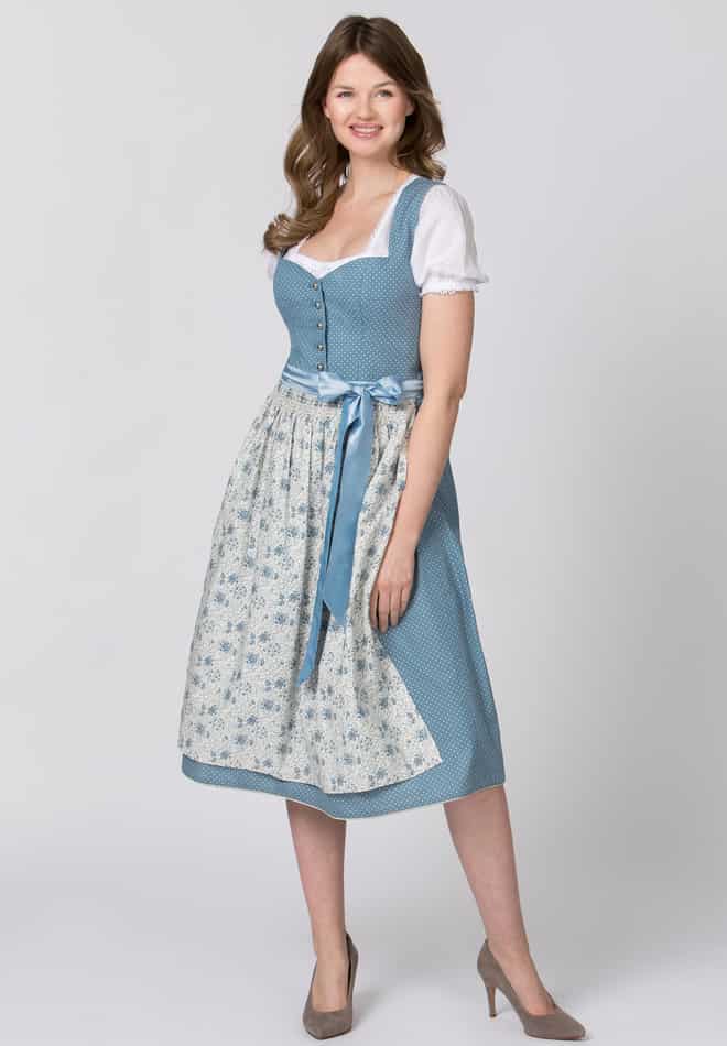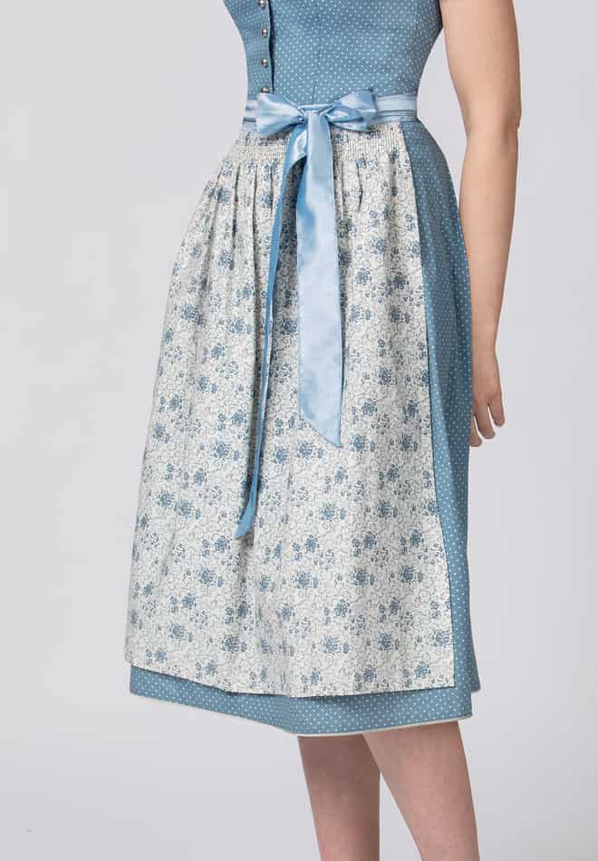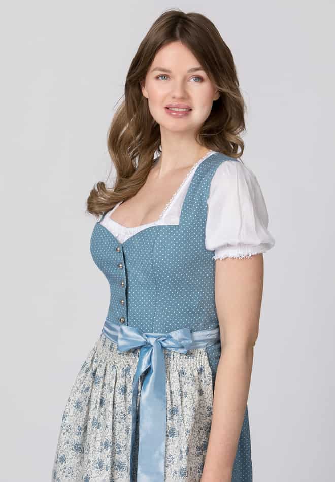 Dirndl Edonita von Heimatgwand. Das sommerliche Dirndl aus pflegeleichter Baumwolle begeistert durch den femininen Schnitt, der auch ohne Dirndlbluse getragen werden kann. Die zart geblümte Dirndlschürze mit einfarbigem Schürzenband ist ein weiteres Highlight, das die feminine Passform unterstreicht. Die traditionellen Kugelknöpfe zeigen die Liebe zum Detail. Ein Lieblingsstück für die modebewusste Trachtenliebhaberin. Unser Model trägt die Dirndlbluse Leana in weiß.