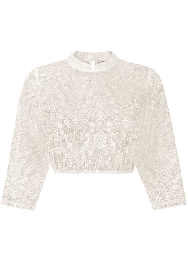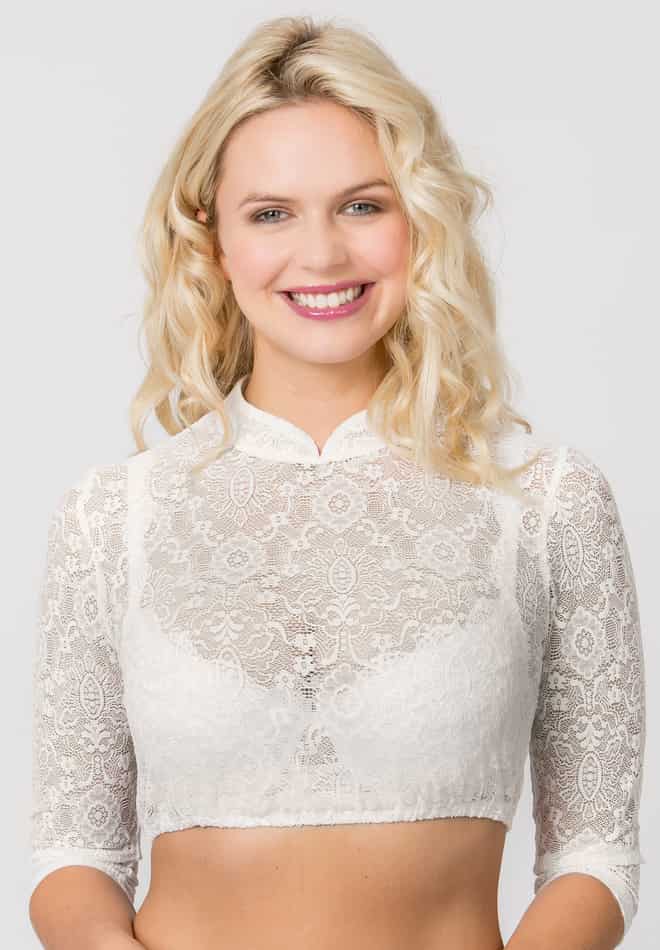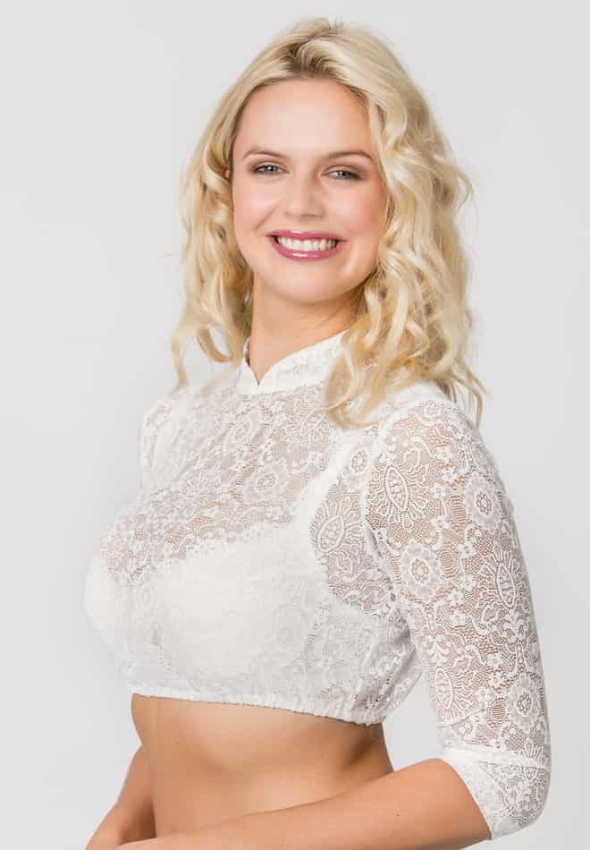 Die Dirndlbluse Celine bezaubert mit einem edlen, floralen Spitzenbild und verkörpert feminine Eleganz in ihrer modernsten Form. Ihr hochgeschlossener Schnitt mit feinem Stehkragen verleiht jedem Dirndl eine stilvolle, anmutige Ausstrahlung – perfekt für Frauen, die klassische Tracht mit einem zeitgemäßen, eleganten Twist kombinieren möchten.Die 3/4-Ärmel aus weicher, detailreich gearbeiteter Spitze schaffen eine harmonische Silhouette und umschmeicheln die Figur, ohne aufzutragen. Das filigrane Muster verleiht der Bluse eine romantische Leichtigkeit und lässt sie mühelos zu festlichen wie auch traditionellen Anlässen strahlen.Celine ist in vier wunderschönen Farbvarianten erhältlich und passt sich so jedem Stil und jeder Dirndlfarbe an. Dank ihres angenehmen Tragegefühls und der pflegeleichten Qualität wird sie schnell zum unverzichtbaren Liebling Ihrer Trachtengarderobe.Ein vielseitiger Klassiker, der jedes Dirndl um eine elegante, feminine Note ergänzt – stilvoll, zeitlos und mit Liebe zum Detail gefertigt.