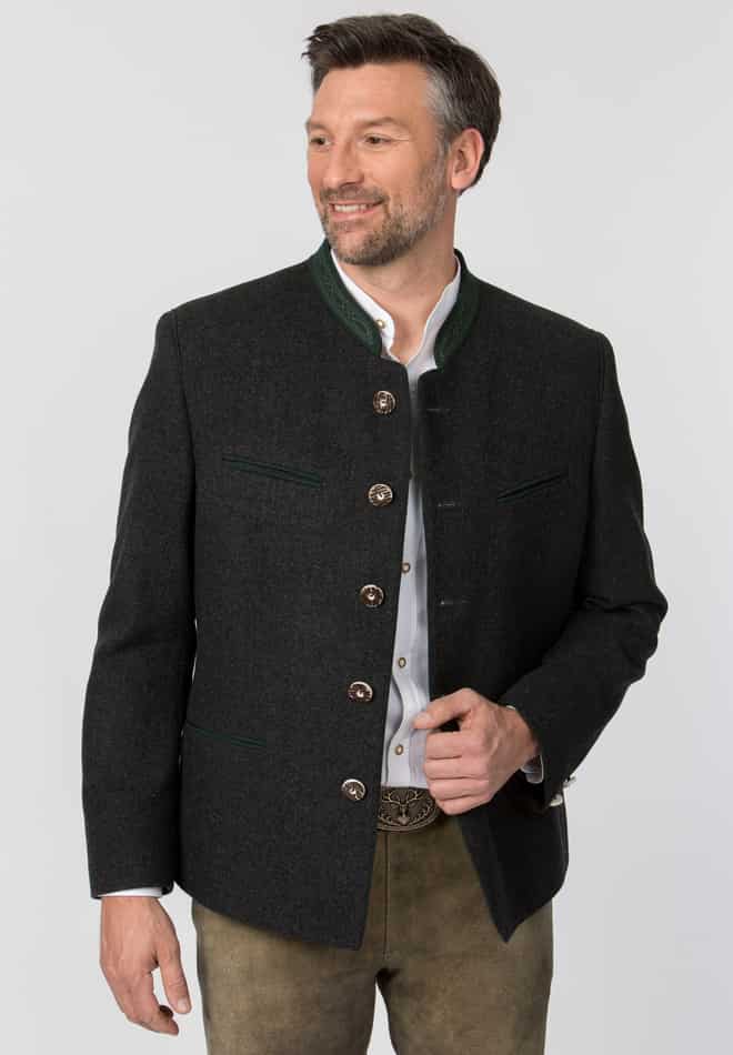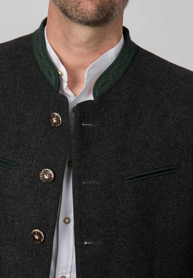 Trachtensakko Stachus von Stockerpoint Classics. Der traditionelle Trachtenjanker ist aus einer hochwertigen melierten Lodenqualität gefertigt. Die klassische, gerade Schnittführung garantiert eine sehr gute Passform und einen angenehmen Tragekomfort. Farblich abgestimmter, bestickter Stehkragen und Paspel unterstreichen das markante Design. Der Rücken ist mit einer Kellerfalte gearbeitet und setzt eine klassische Note. Rustikale Hornknöpfe runden das edle Erscheinungsbild gekonnt ab. Das Sakko ist der ideale Kombipartner zu unseren Lederhosen und Trachtenwesten und prägen den klassischen Trachtenlook.