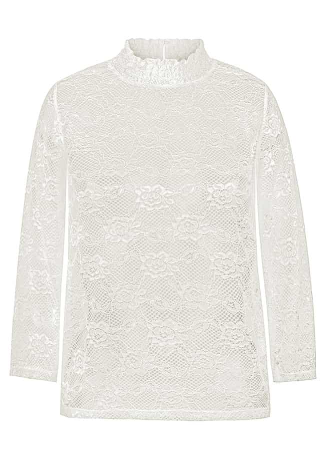Trachten Shirt Molly von Stockerpoint in creme. Das hochgeschlossene Langarm-Shirt in „Comfort-Fit“ überzeugt durch ihre hervorragende gerade Passform. Der transparente Spitzenstoff und der elegante Stehkragen mit Perlknöpfen am Kragen sorgen für zusätzliche Akzente und runden das Design perfekt ab.