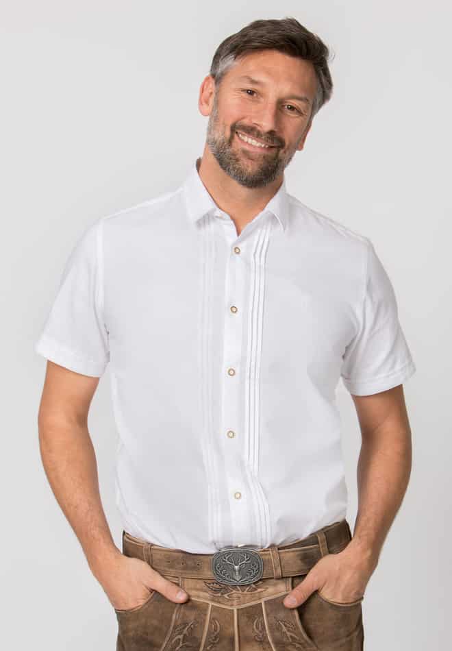 Trachtenhemd Bodo von Stockerpoint Classics in weiß. Das hochwertige Kurzarmhemd mit Kentkragen aus angenehmer Baumwoll-Qualität besticht durch die stilvollen Biesen und den trachtigen Hornknöpfen an der Knopfleiste. Zeitlos und traditionell ist dieses Modell in „Comfort Fit“ geschnitten und passt sich jeder Körperform perfekt an. Der ideale Kombipartner zu deinem traditionellen Trachtenoutfit.