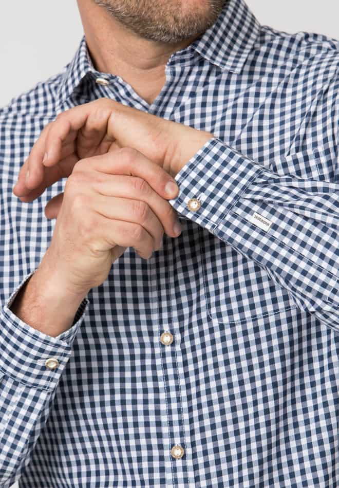 Trachtenhemd Campos von Stockerpoint Classics. Der Trachten Klassiker aus angenehmer Baumwoll-Qualität in Karo-Optik ist die perfekte Ergänzung zum traditionellen Trachtenoutfit. Dieses hochwertige Hemd ist perfekt kombinierbar zu deiner Lieblingshose und ist unentbehrlich als Kombipartner zu unseren Trachtenwesten und Trachtenjacken. Das Modell ist in „Comfort Fit“ geschnitten und passt sich jeder Körperform perfekt an. Die trachtigen Hornknöpfe verleihen eine besondere Note und prägen den traditionellen Stil.