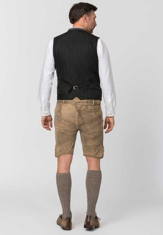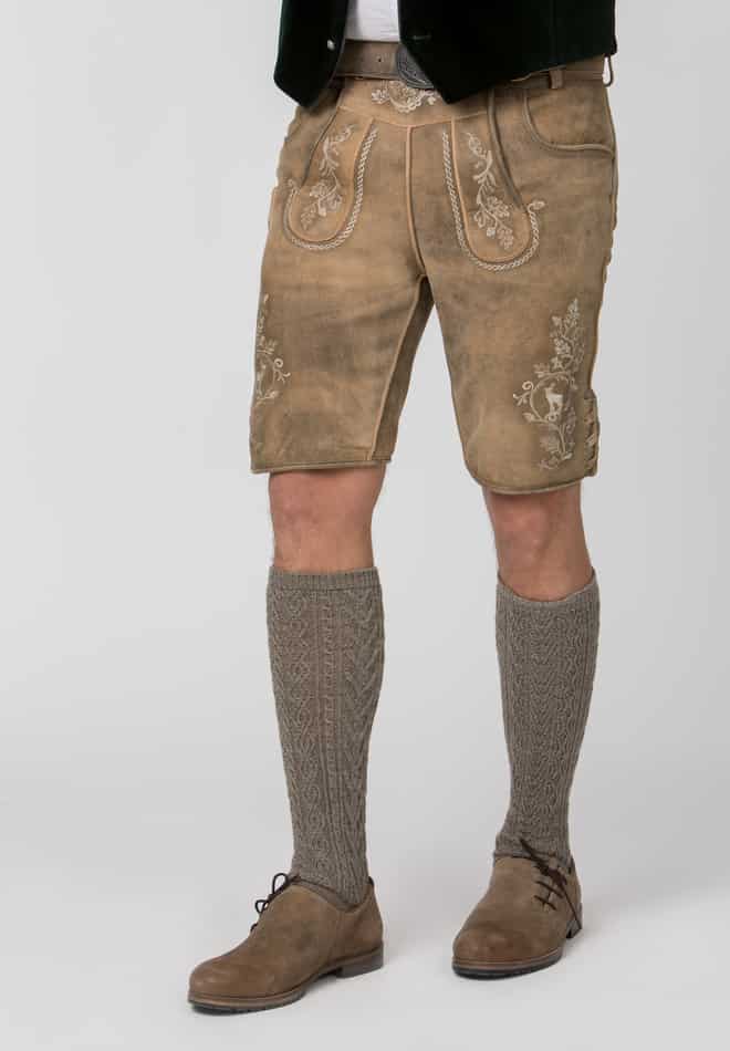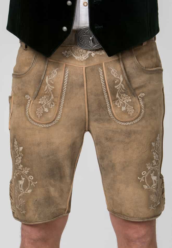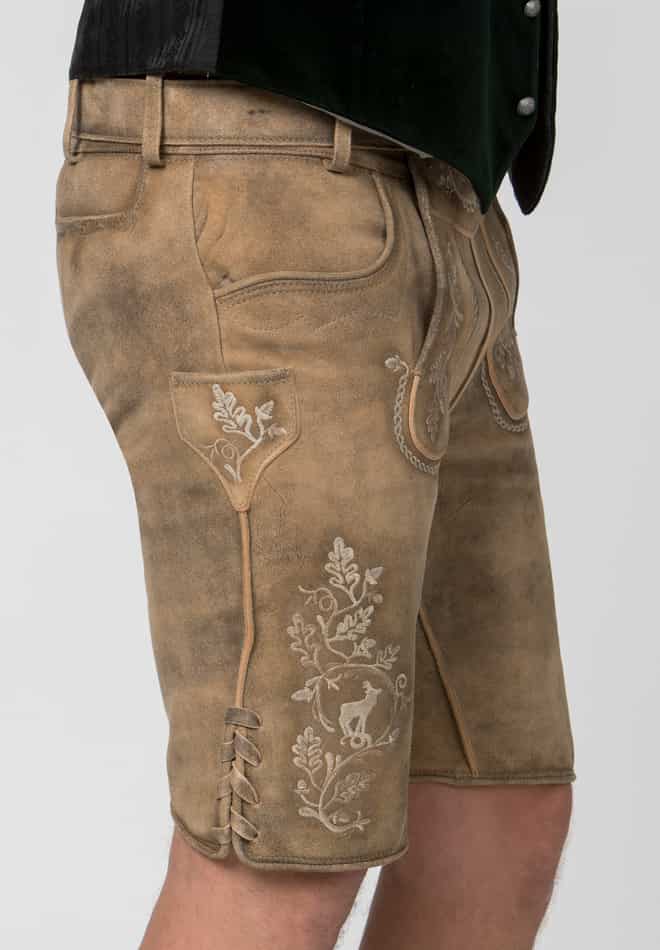 Trachtenlederhose Girgl von Stockerpoint Classics. Die kurze Plattlerhose aus hochwertig gegerbtem Wildbock Leder in Hirschoptik steht für Verbundenheit mit der Heimat. Die Blattstickerei ist nach alten Vorbildern gefertigt und in den klassischen Farben mit viel Handarbeit originalgetreu umgesetzt. Diese traditionelle Lederhose wird mit Hirschmotiven und Eichenlaub bestickt und prägen den unverwechselbaren Stil. Das Modell wird mit einem Gürtel incl. Bayernschließe in altsilber geliefert.