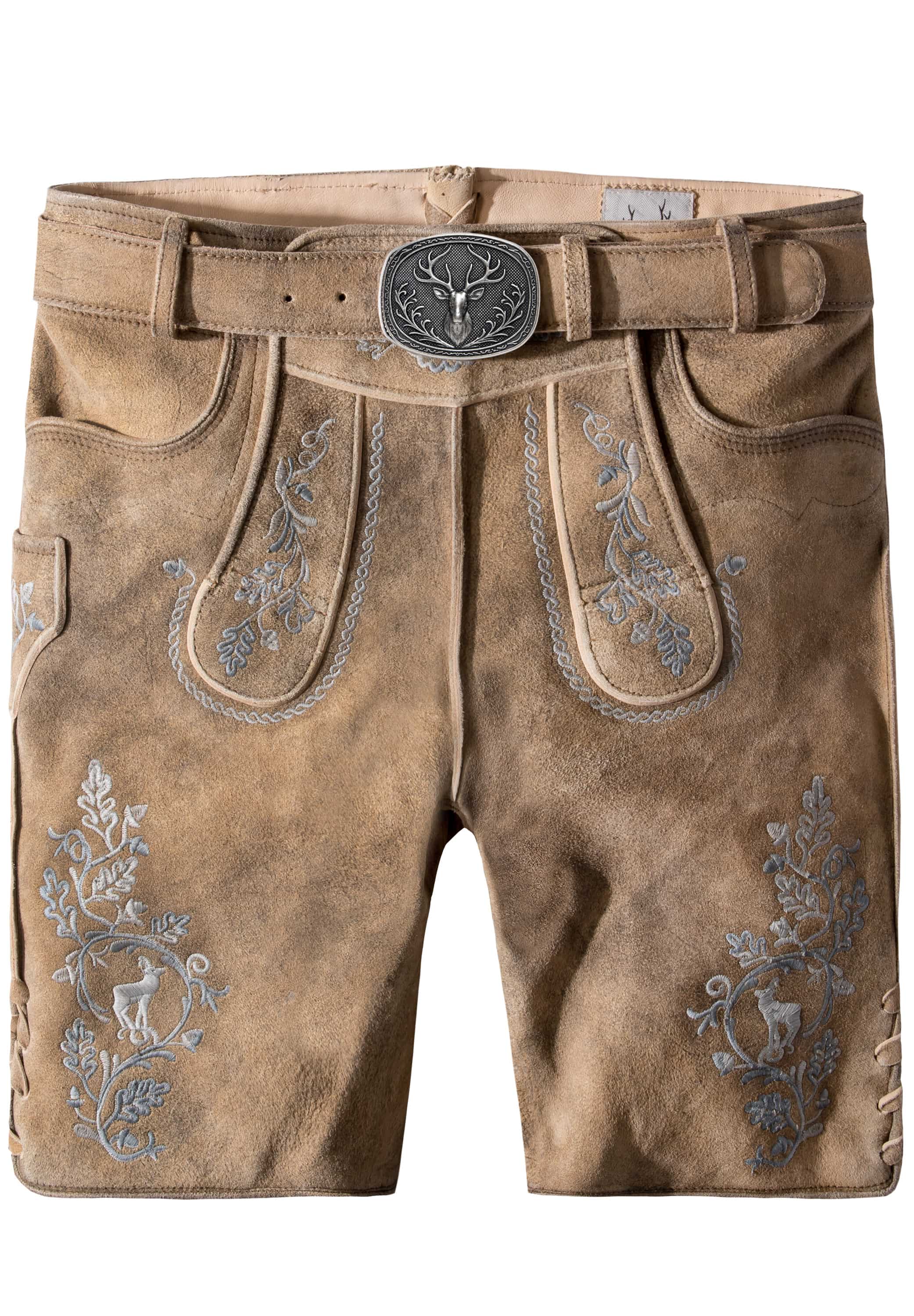 Trachtenlederhose Girgl von Stockerpoint Classics. Die kurze Plattlerhose aus hochwertig gegerbtem Wildbock Leder in Hirschoptik steht für Verbundenheit mit der Heimat. Die Blattstickerei ist nach alten Vorbildern gefertigt und in den klassischen Farben mit viel Handarbeit originalgetreu umgesetzt. Diese traditionelle Lederhose wird mit Hirschmotiven und Eichenlaub bestickt und prägen den unverwechselbaren Stil. Das Modell wird mit einem Gürtel incl. Bayernschließe in altsilber geliefert.
