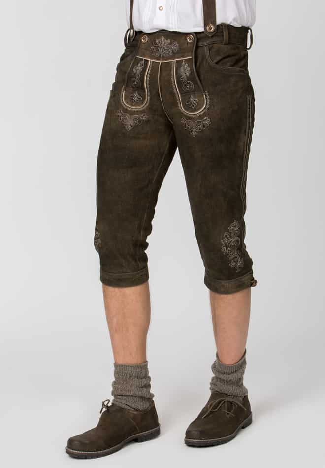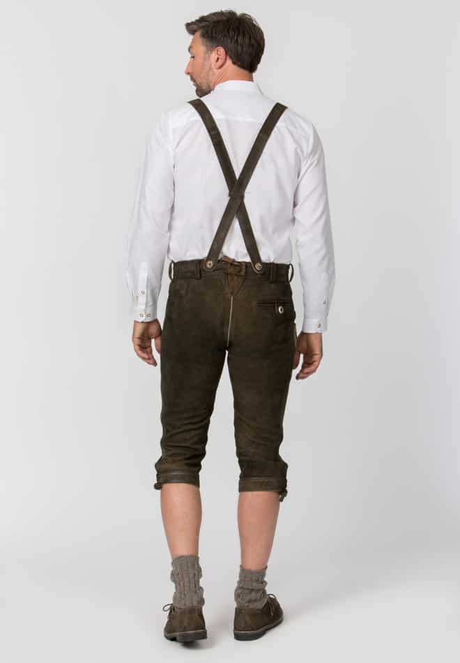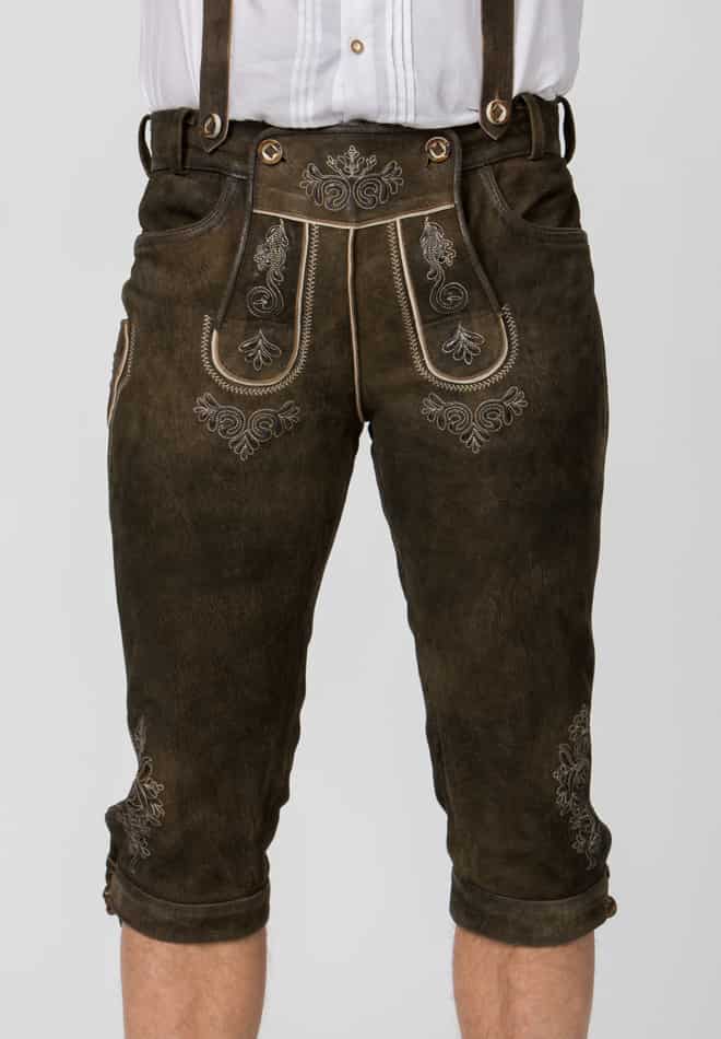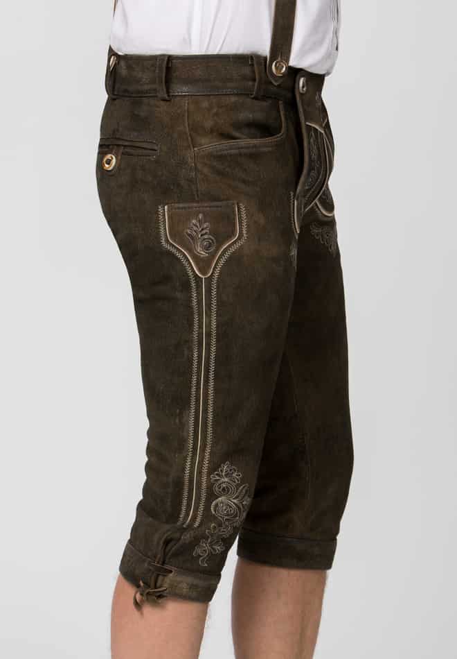Trachtenlederhose Justin von Stockerpoint Classics. Die Kniebund Lederhose aus hochwertig gegerbtem Wildbock Leder in Hirschoptik zeichnet sich durch die außergewöhnliche Strukturierung aus und harmoniert perfekt mit den klassischen Hornknöpfen. Sie ist die am meisten gekaufte Kniebundhose. Die traditionelle Stickerei steht dezent im Vordergrund und verleiht dem Modell ihren typischen Charakter. Durch die Schnürung am Bund und am Beinabschluss lässt sie sich individuell verstellen und dem Körper genau anpassen. Die Hose wird mit einem passenden H-Träger geliefert. Sie ist ein Allrounder und lässt sich zu vielen traditionellen Trachtenoutfits perfekt kombinieren.