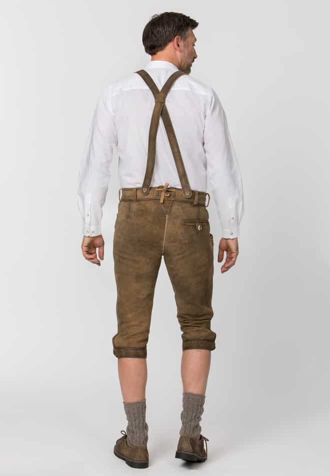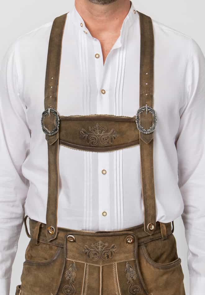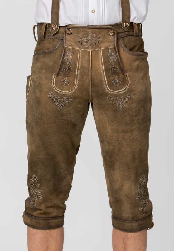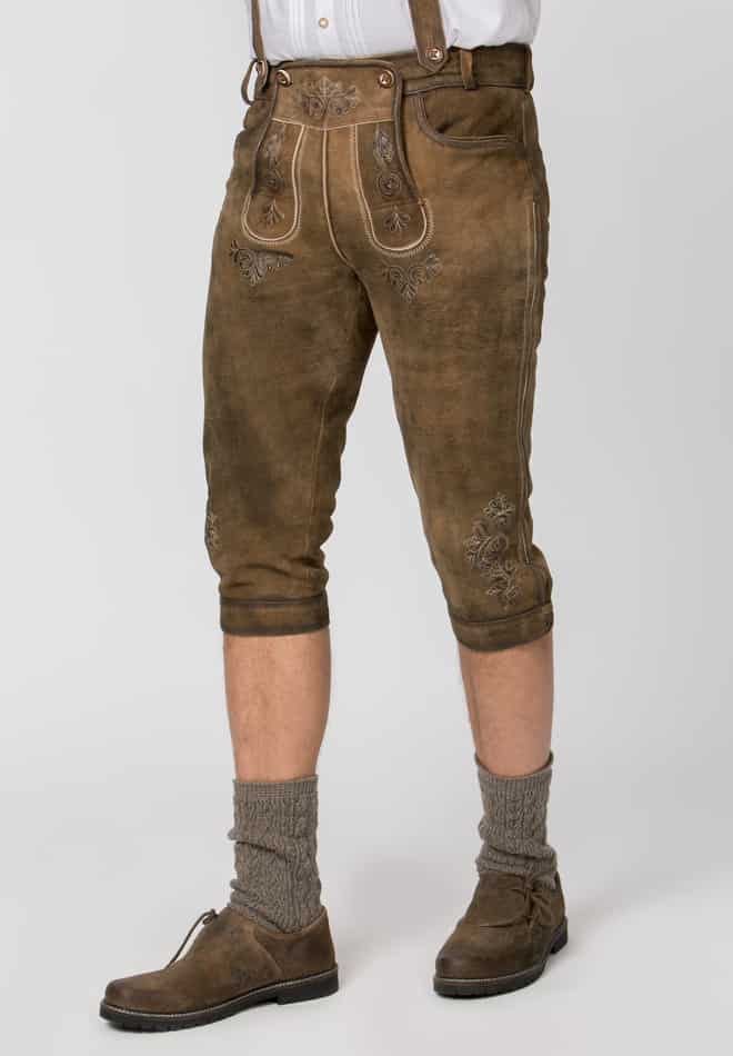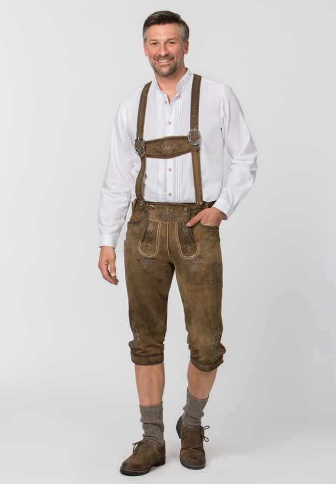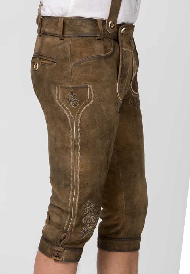Trachtenlederhose Justin von Stockerpoint Classics. Die Kniebund Lederhose aus hochwertig gegerbtem Wildbock Leder in Hirschoptik zeichnet sich durch die außergewöhnliche Strukturierung aus und harmoniert perfekt mit den klassischen Hornknöpfen. Sie ist die am meisten gekaufte Kniebundhose. Die traditionelle Stickerei steht dezent im Vordergrund und verleiht dem Modell ihren typischen Charakter. Durch die Schnürung am Bund und am Beinabschluss lässt sie sich individuell verstellen und dem Körper genau anpassen. Die Hose wird mit einem passenden H-Träger geliefert. Sie ist ein Allrounder und lässt sich zu vielen traditionellen Trachtenoutfits perfekt kombinieren.