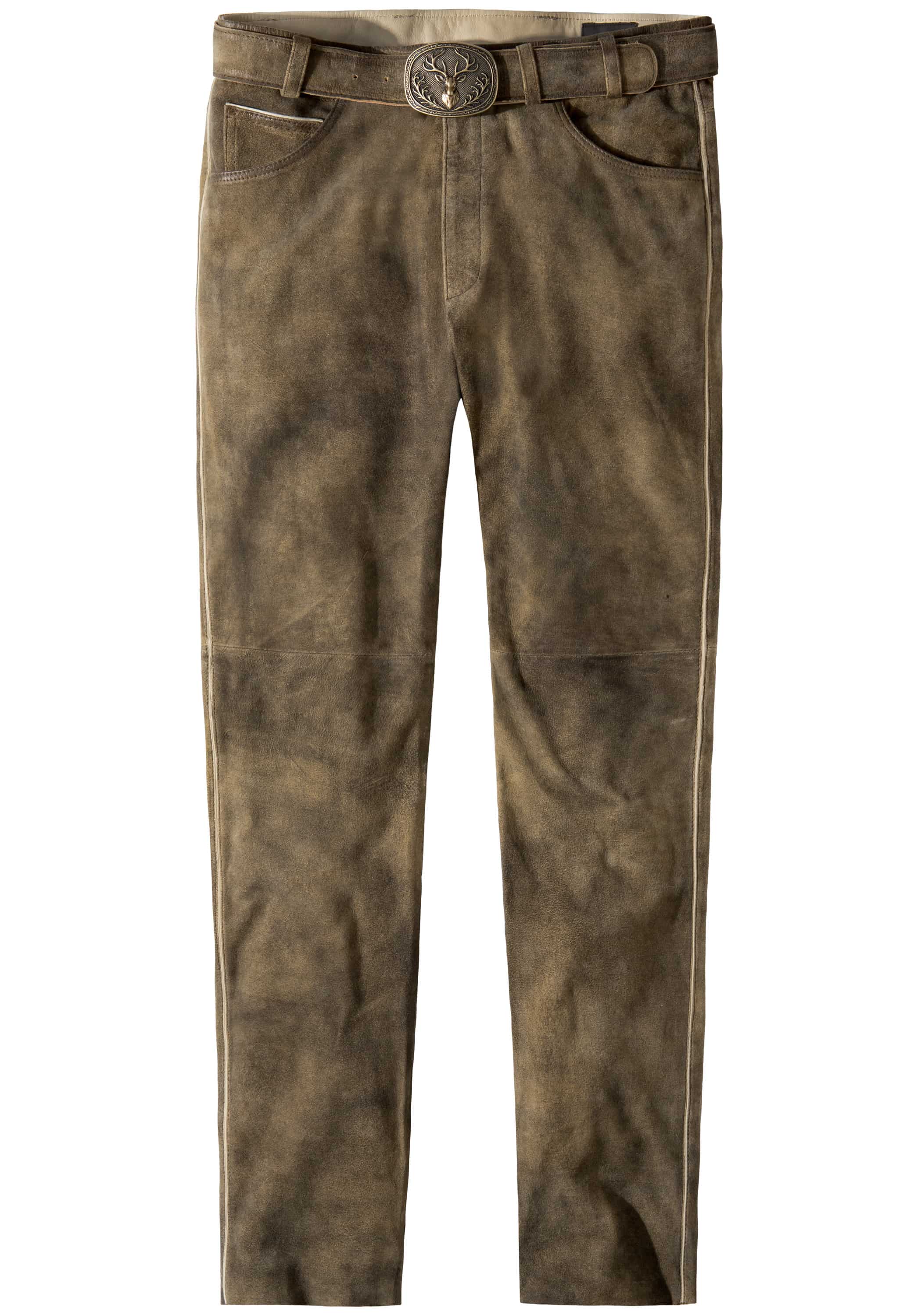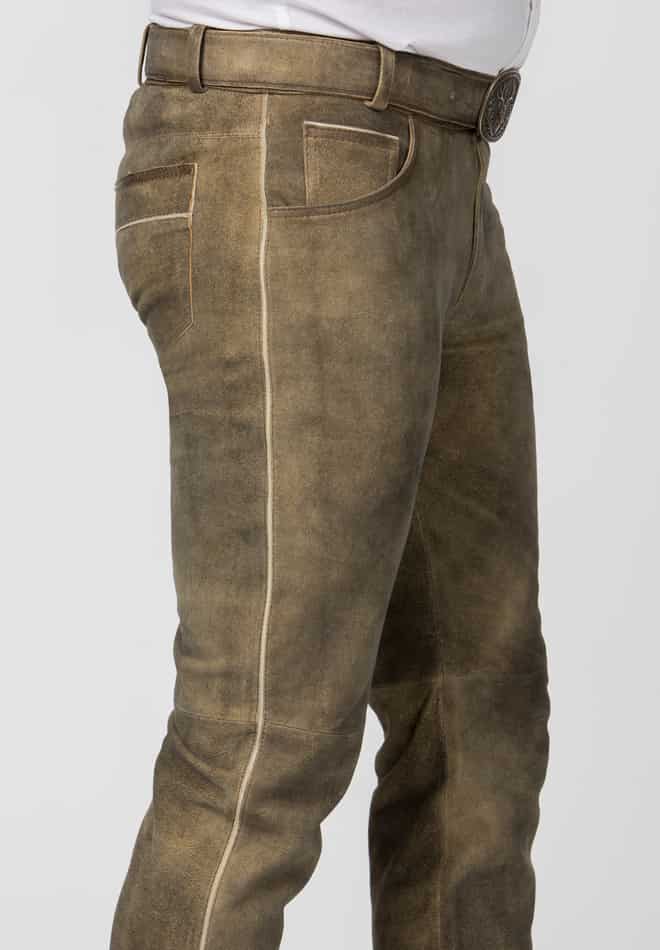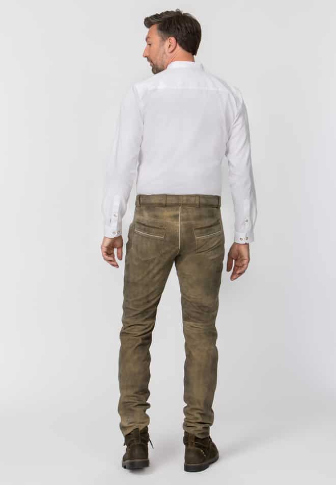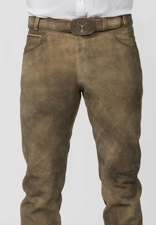 Die lange Lederhose Marlon steht für schlichte, traditionelle Trachtenmode in ihrer reinsten Form. Gefertigt aus hochwertigem, gespecktem Ziegenleder, überzeugt sie durch außergewöhnliche Weichheit, Robustheit und hohen Tragekomfort – ideal für lange Festtage oder traditionelle Anlässe.Ohne aufwendige Stickereien präsentiert sich Marlon bewusst zurückhaltend und klassisch. Der Ledergürtel mit dekorativer Schließe in Altsilber setzt einen stilvollen Akzent und rundet das elegante Gesamtbild harmonisch ab.Dank ihres klaren Schnitts, der hochwertigen Verarbeitung und des weichen Leders bietet die Hose optimale Bewegungsfreiheit und Langlebigkeit. Marlon ist die perfekte Wahl für Männer, die Wert auf Tradition, Qualität und zeitlose Eleganz legen.