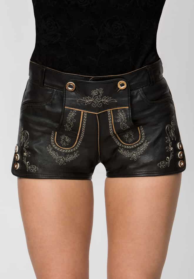 Lederhose Mona von Stockerpoint in schwarz. Die kurze, feminine Damenlederhose aus hochwertigem weichem Nappa Leder zeichnet sich durch den ausgefallenen Trachten-Look aus. Die Hose ist mit einer filigraner Stickerei aufwendig bestickt und liebevoll von Hand veredelt. Hochwertige Hornknöpfe setzten das Modell gekonnt in Szene und prägen den besonderen Look. Die kurze Hose ist dein ständiger Begleiter und ein „must have“ für jede Trachten Liebhaberin.