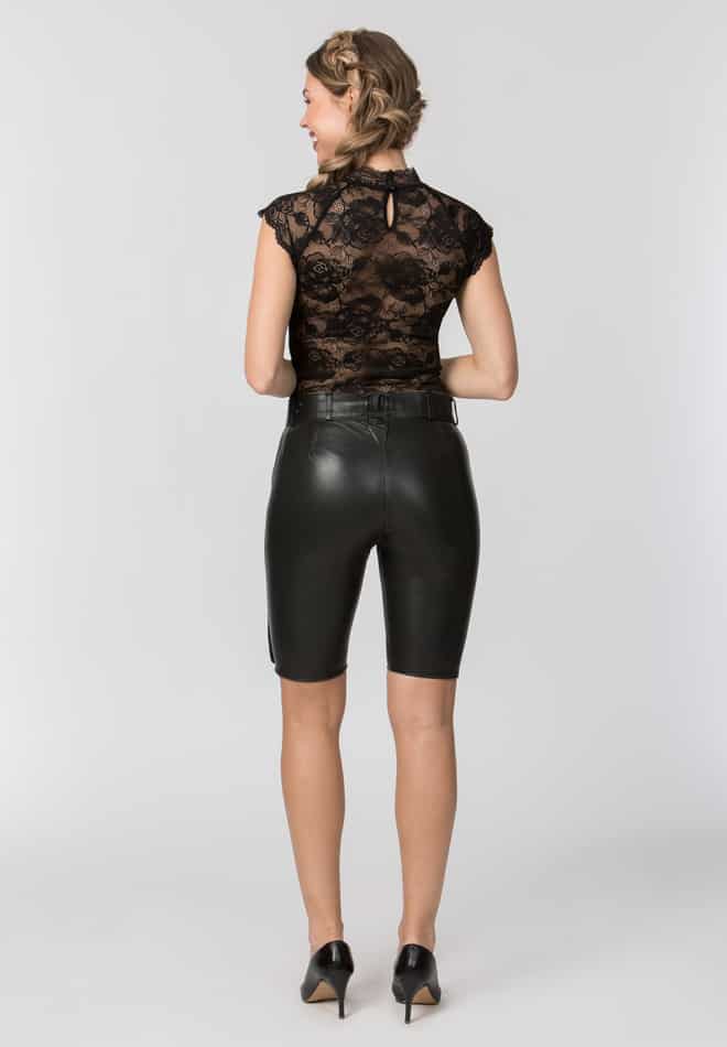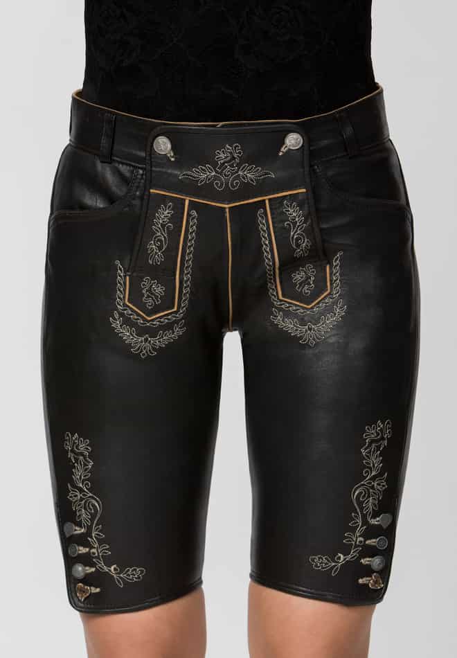 Lederhose Roxanne von Stockerpoint in black nappa. Die Trachten Bermuda aus hochwertigem weichem Nappa Leder zeichnet sich durch den ausgefallenen Trachten-Look aus. Die Hose ist mit einer filigranen Stickerei aufwendig bestickt und liebevoll von Hand veredelt. Hochwertige Knöpfe setzten das Modell gekonnt in Szene und prägen den besonderen Look. Die Hose ist vielseitig kombinierbar und zieht alle Blicke auf sich.