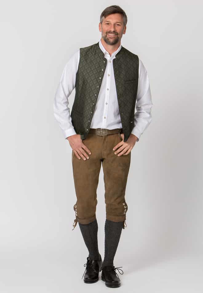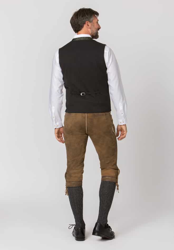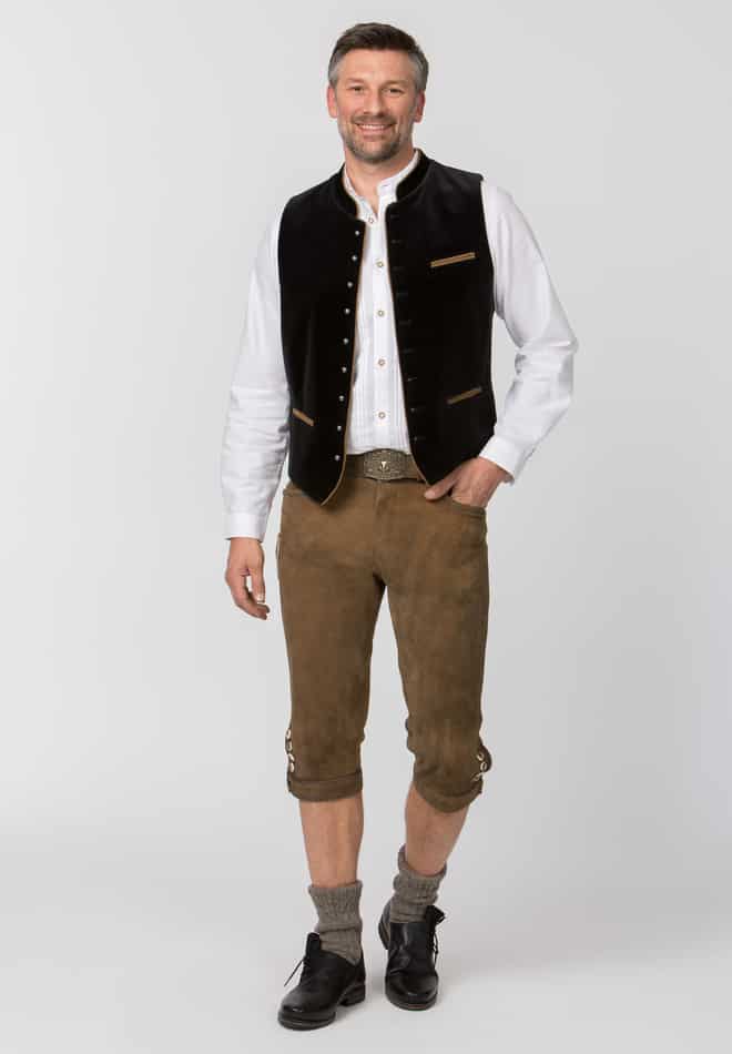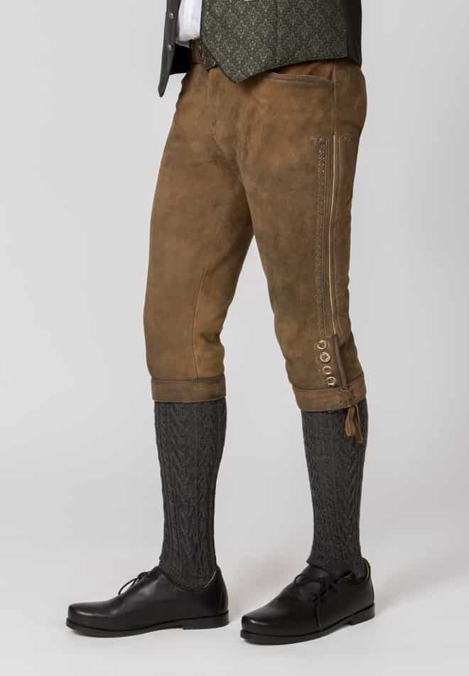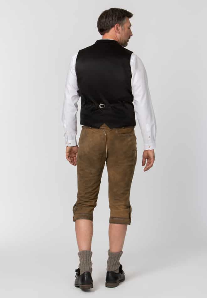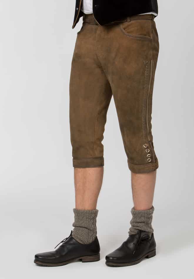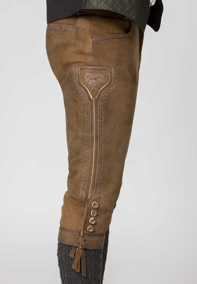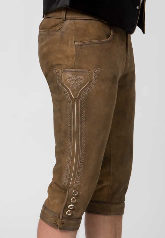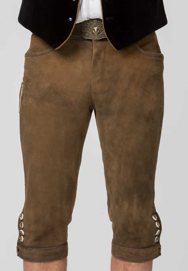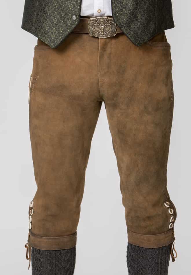 Trachtenlederhose Siggi von Stockerpoint Classics. Die Kniebund Lederhose aus hochwertig gegerbtem Wildbock Leder in Hirschoptik zeichnet sich durch die außergewöhnliche Strukturierung aus und harmoniert perfekt mit den klassischen Hornknöpfen. Statt mit einem Latz wird diese Hose mit Reißverschluss gefertigt. Die traditionelle Stickerei steht dezent im Vordergrund und verleiht dem Modell ihren typischen Charakter. Durch die Schnürung am Bund und am Beinabschluss lässt sie sich individuell verstellen und dem Körper genau anpassen. Die Hose wird mit einem Gürtel und einer Schließe mit Hirschmotiv in altsilber geliefert. Sie ist ein Allrounder und lässt sich zu vielen traditionellen Trachtenoutfits perfekt kombinieren.