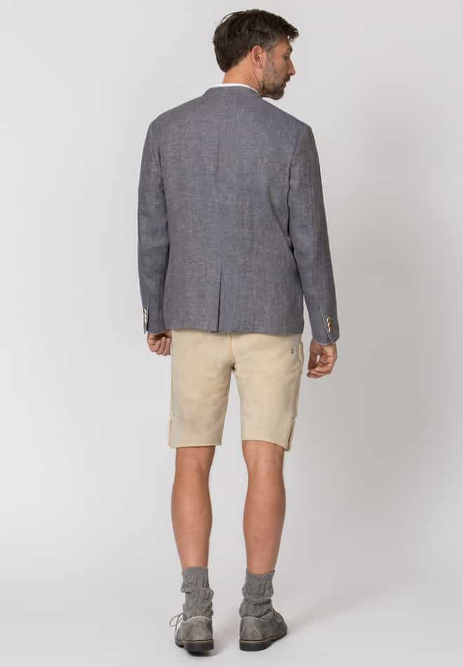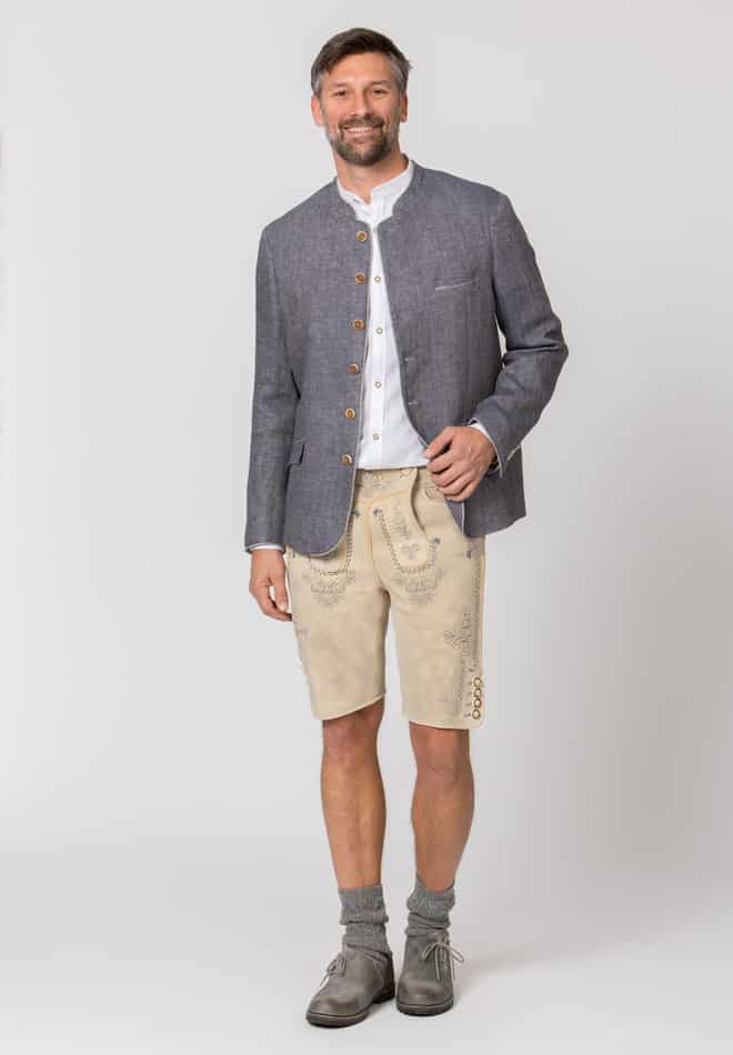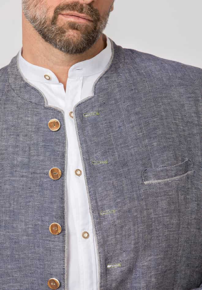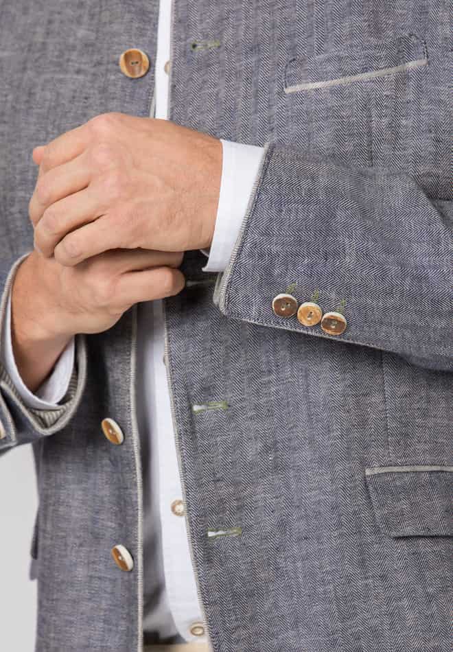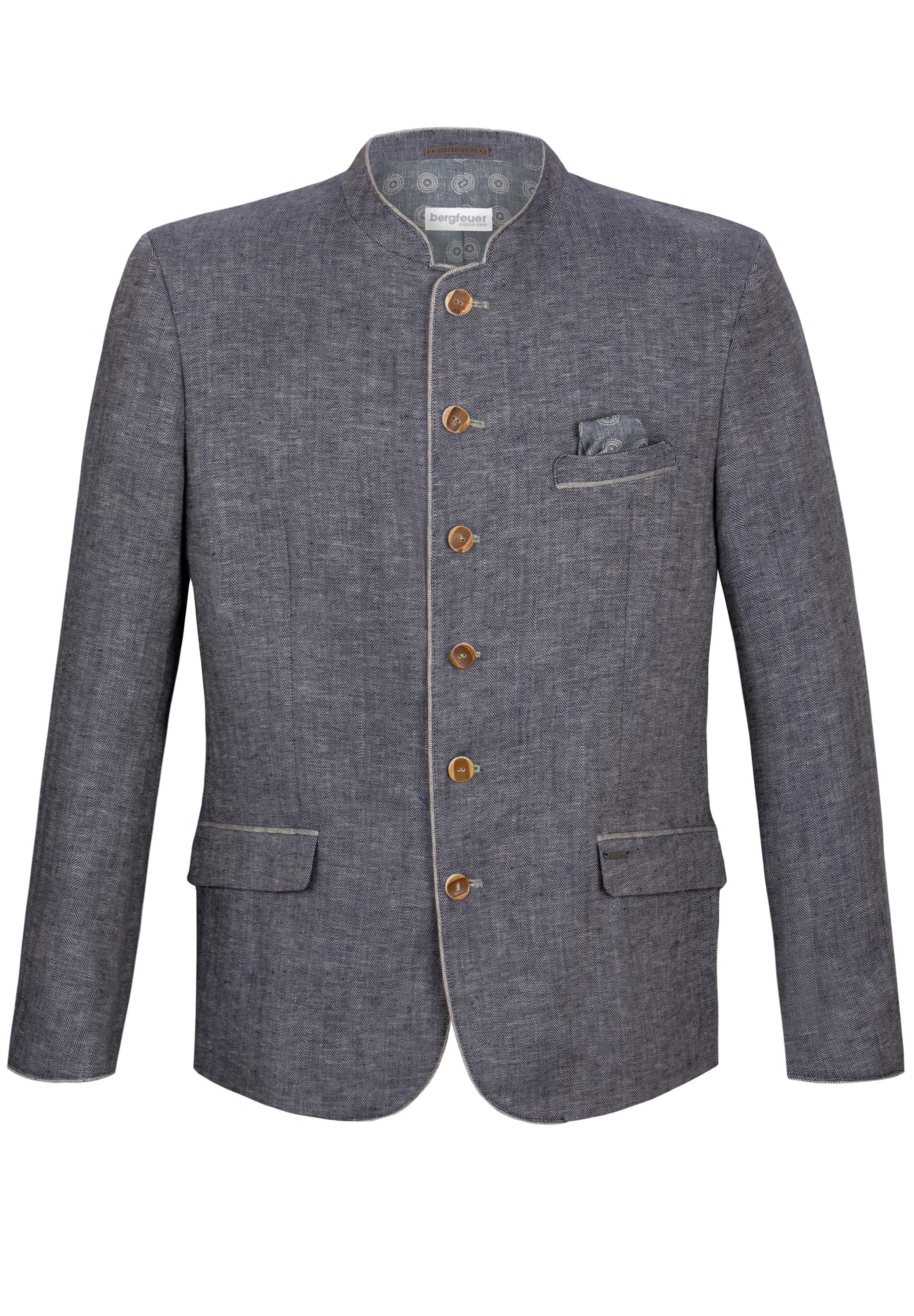 Das Trachtensakko Adriano aus der Bergfeuer Kollektion wurde aus hochwertigem, meliertem Leinen mit Fischgrat-Muster gefertigt und überzeugt durch erstklassige Handwerkskunst. Die einreihige Knopfleiste und die klassische, gerade Schnittführung mit Pattentaschen gewährleisten eine herausragende Passform und einen angenehmen Tragekomfort. Der farblich abgestimmte Stehkragen sowie die dezente Paspelierung setzen feine Akzente und unterstreichen die Einzigartigkeit dieses Meisterwerks. Im Rücken präsentiert sich das Sakko mit einem mittelnahtbetonten Schlitz, was ihm eine besonders elegante Note verleiht. Traditionelle Hornknöpfe, kunstvoll verarbeitet, runden das edle Erscheinungsbild gekonnt ab und betonen die Liebe zum Detail. Das Sakko ist der ideale Begleiter zu unseren Lederhosen und Trachtenwesten und verkörpert perfekt die gelungene Verbindung von Authentizität und Eleganz. Entdecken Sie mit Bergfeuer den unverwechselbaren Charme echter Trachtenkultur.