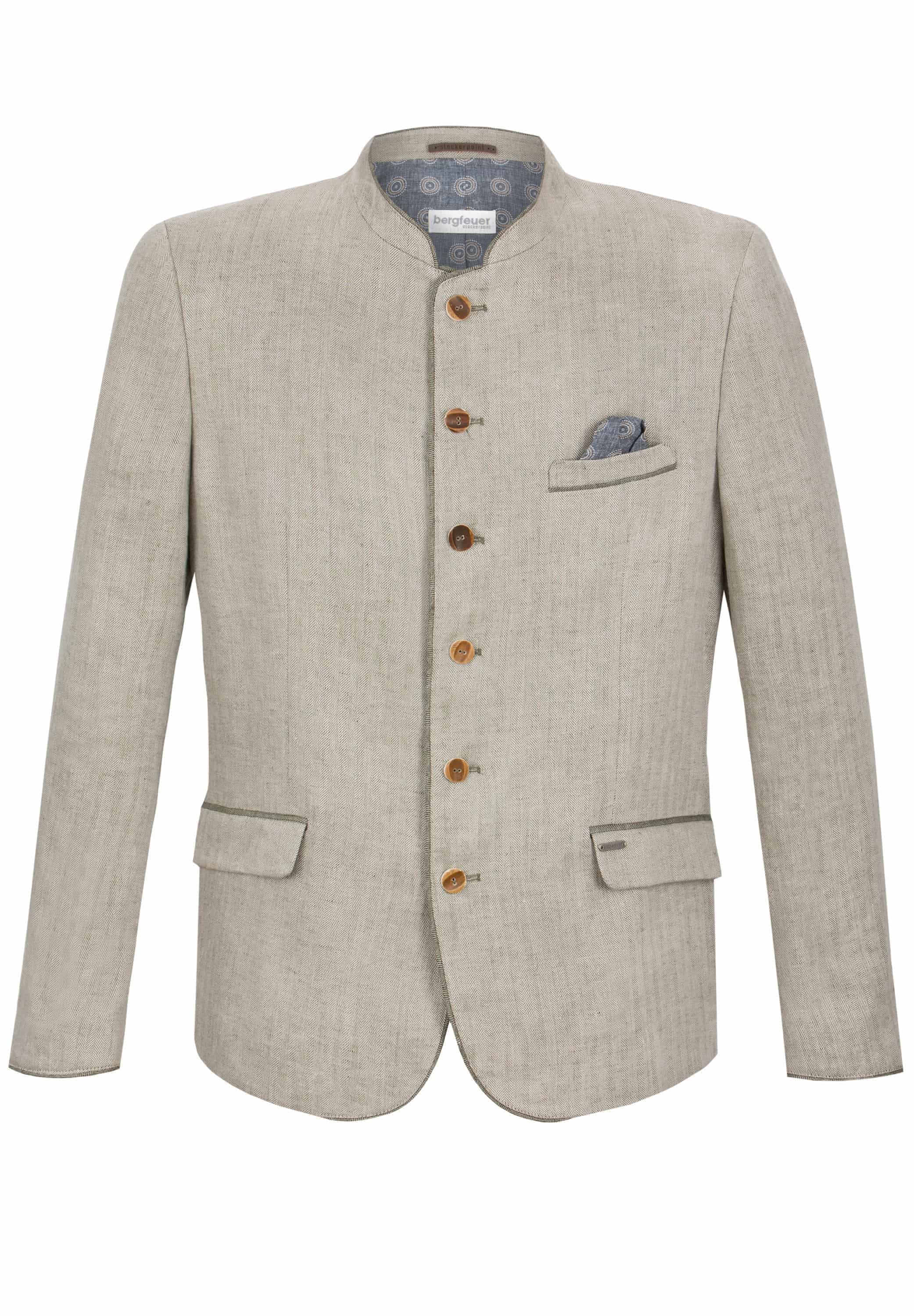 Das Trachtensakko Adriano aus der Bergfeuer Kollektion wurde aus hochwertigem, meliertem Leinen mit Fischgrat-Muster gefertigt und überzeugt durch erstklassige Handwerkskunst. Die einreihige Knopfleiste und die klassische, gerade Schnittführung mit Pattentaschen gewährleisten eine herausragende Passform und einen angenehmen Tragekomfort. Der farblich abgestimmte Stehkragen sowie die dezente Paspelierung setzen feine Akzente und unterstreichen die Einzigartigkeit dieses Meisterwerks. Im Rücken präsentiert sich das Sakko mit einem mittelnahtbetonten Schlitz, was ihm eine besonders elegante Note verleiht. Traditionelle Hornknöpfe, kunstvoll verarbeitet, runden das edle Erscheinungsbild gekonnt ab und betonen die Liebe zum Detail. Das Sakko ist der ideale Begleiter zu unseren Lederhosen und Trachtenwesten und verkörpert perfekt die gelungene Verbindung von Authentizität und Eleganz. Entdecken Sie mit Bergfeuer den unverwechselbaren Charme echter Trachtenkultur.
