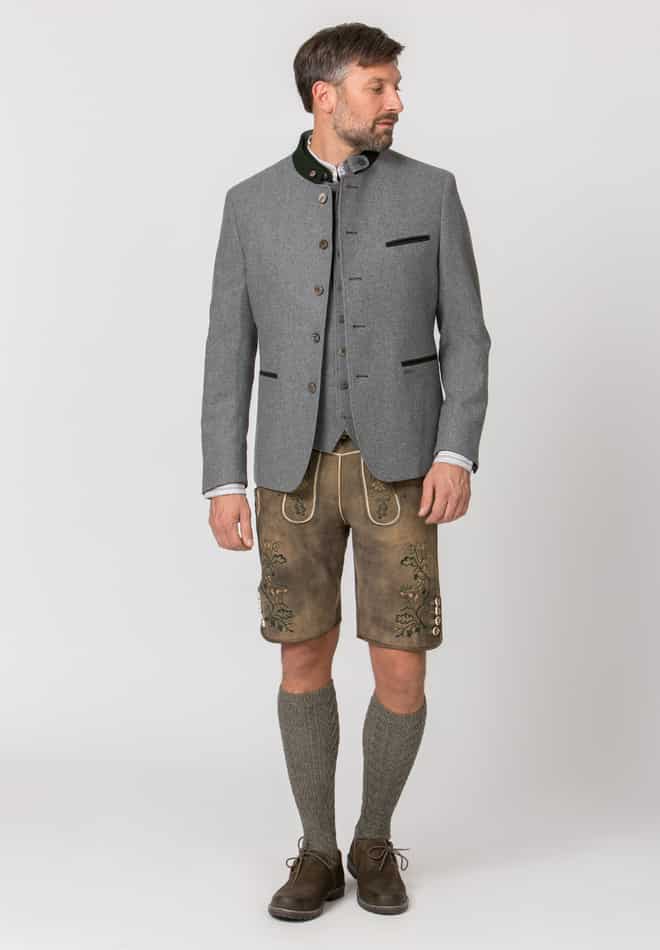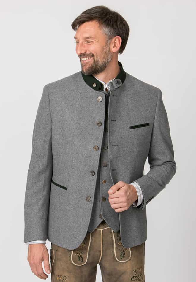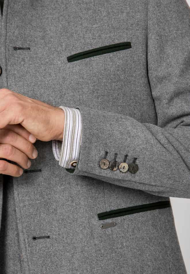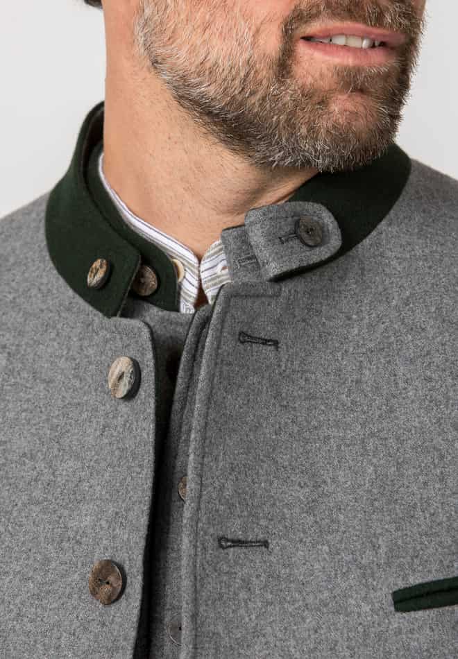 Die Trachtenjacke Augusto vereint klassische Trachtenästhetik mit hochwertiger Verarbeitung und zeitloser Eleganz. Gefertigt aus einem feinem Lodenstoff, überzeugt die Jacke durch angenehme Haptik, Wärme und eine formstabile Passform – perfekt für traditionelle Anlässe und festliche Trachtenoutfits. Ein farblich abgehobener Rundhalskragen setzt elegante Akzente und unterstreicht die klassische Linienführung. Traditionelle Trachtenknöpfe und eine präzise Paspelierung verleihen der Jacke ein authentisches, edles Finish. Der Rundhalsausschnitt sorgt für einen harmonischen Look, der sich sowohl über Hemd oder Trachtenhemd als auch solo hervorragend tragen lässt. Augusto ist die ideale Wahl für Männer, die Wert auf hochwertige Materialien, stilvolle Details und klassische Trachtenmode legen.