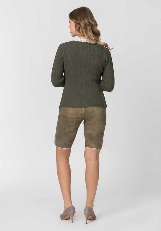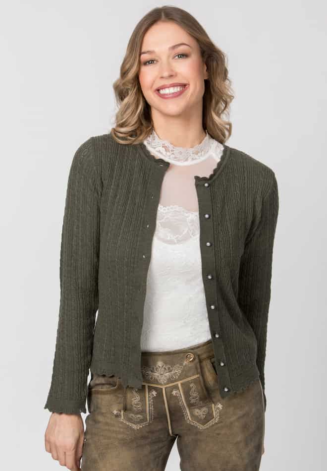 Die Trachtenstrickjacke Jasmina von Heimatgwand begeistert mit zeitloser Eleganz und liebevoll ausgearbeiteten Details. Gefertigt aus einem geschmeidig weichen Wollmix, bietet sie ein angenehm warmes Tragegefühl und höchsten Komfort – ideal für festliche Anlässe ebenso wie für stilvolle Alltagslooks. Der Rundhalsausschnitt wird von einer feinen Borte stilvoll eingefasst und verleiht der Jacke eine dezente, feminine Note. Ein elegantes Zopfmuster, bewusst zurückhaltend interpretiert, sorgt für Struktur und Tiefe, ohne den klaren Look zu überladen. Der taillierte Schnitt schmeichelt der Silhouette und unterstreicht die feminine Linienführung auf besonders schöne Weise. Edle Perlmuttknöpfe setzen feine Akzente und runden das hochwertige Design harmonisch ab. Jasmina ist eine vielseitige Trachtenstrickjacke für Frauen, die klassische Schönheit, hohen Tragekomfort und eine stilvolle Ausstrahlung zu schätzen wissen.