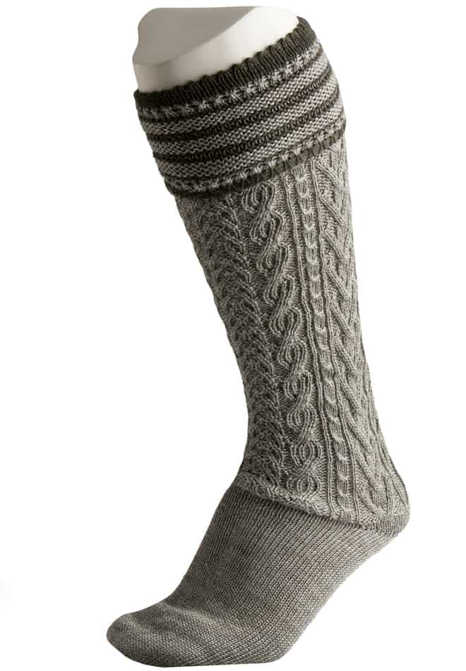 Die Trachten-Kniestrümpfe Robert von Stockerpoint Classics sind eine perfekte Ergänzung zu einem traditionellen Trachten-Look. Sie zeichnen sich durch ihr klassisches Zopfmuster aus, dass zusammen mit dem farblich abgesetzten Bund das optische Highlight bildet. Der hohe Wollanteil sorgt nicht nur für einen edlen Look, sondern garantiert auch hervorragenden Tragekomfort. Diese Kniestrümpfe sind ideal, um sie mit kurzen Lederhosen zu kombinieren und bieten die perfekte Balance aus traditionellem Design und modernem Tragekomfort. Die Strümpfe Robert passen hervorragend zu einem festlichen oder rustikalen Outfit und runden den Trachten-Look stilvoll ab.