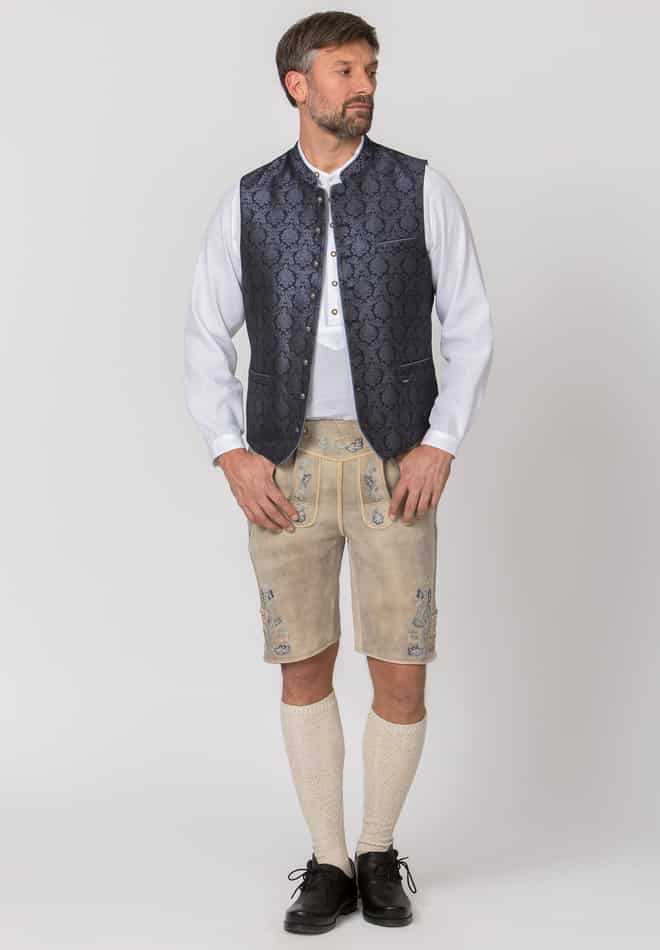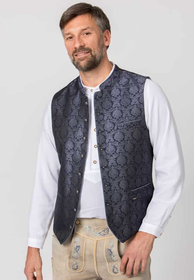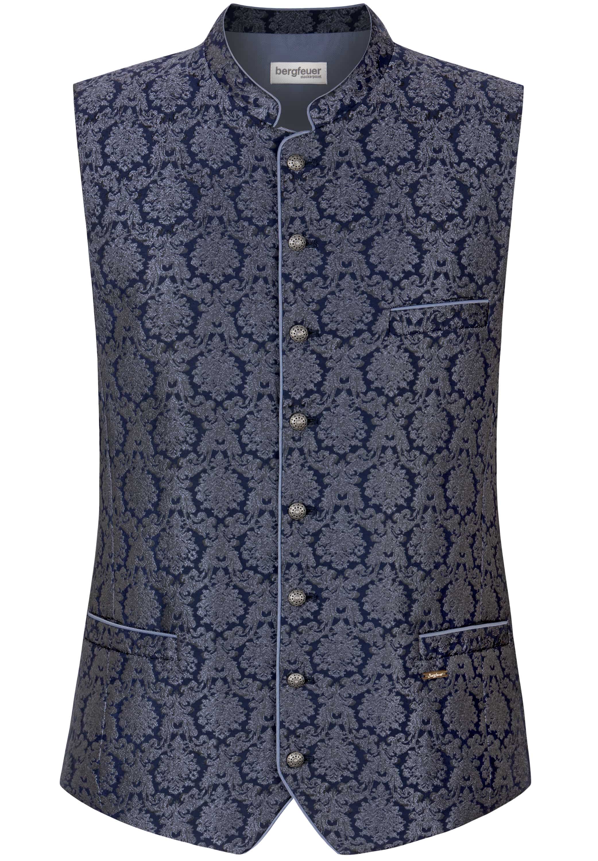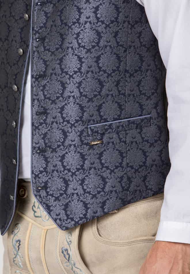 Die Trachtenweste Pio von Bergfeuer überzeugt mit ihrem edlen Jacquard-Stoff in der modernen Trendfarbe Salbei oder zeitlosem Dunkelblau mit elegantem Blumenmuster und dem klassischen Stehkragen. Die aufwendig gearbeitete Weste besticht durch hochwertige Kugelknöpfe in Altsilber, die dem zeitgemäßen Trachtenlook eine traditionelle Note verleihen. Eine funktionale Brusttasche und Paspeltaschen mit dezentem Paspelbesatz bieten praktischen Stauraum, während die taillierte Passform eine stilvolle Silhouette betont. Das Rückenteil mit verstellbarem Riegel sorgt für eine perfekte Passform und hohen Tragekomfort. Ob zur Lederhose traditionell kombiniert oder modern zur Jeans getragen - die Weste ist ein zeitloser Begleiter für Oktoberfest, Hochzeiten und festliche Anlässe. Ein Must-have für alle, die Wert auf Stil, Qualität und authentische Handwerkskunst legen.