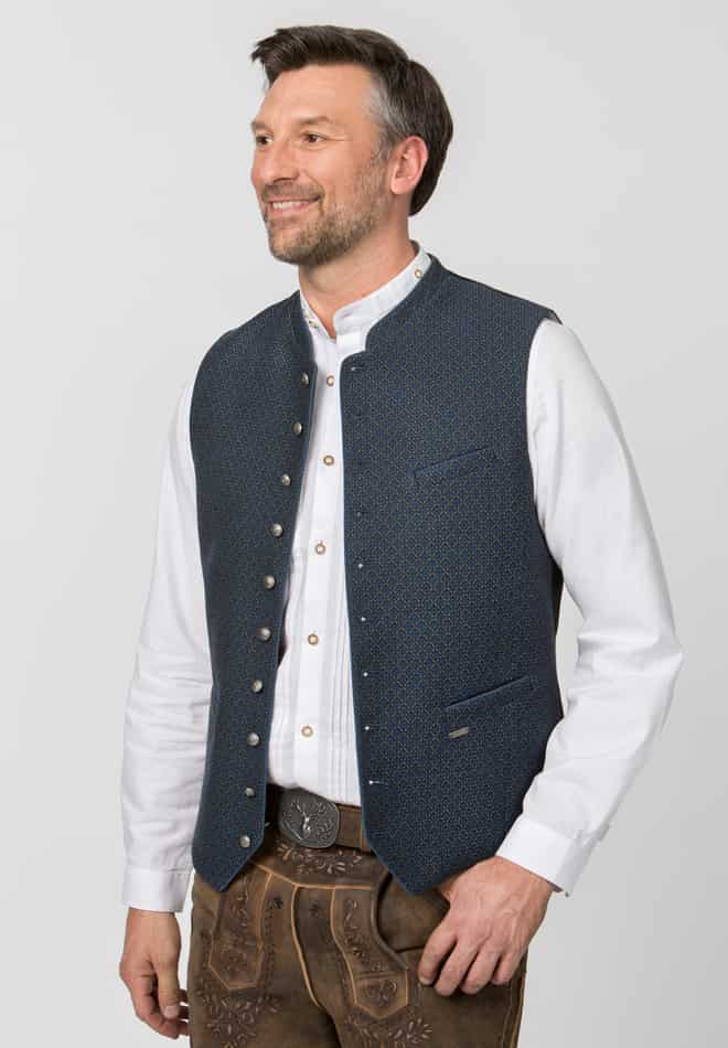 • Elegante Trachtenweste für Herren: Feiner Jacquard-Stoff in tiefem Blau für eine stilvolle Optik.