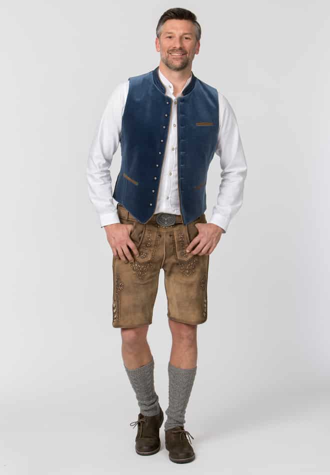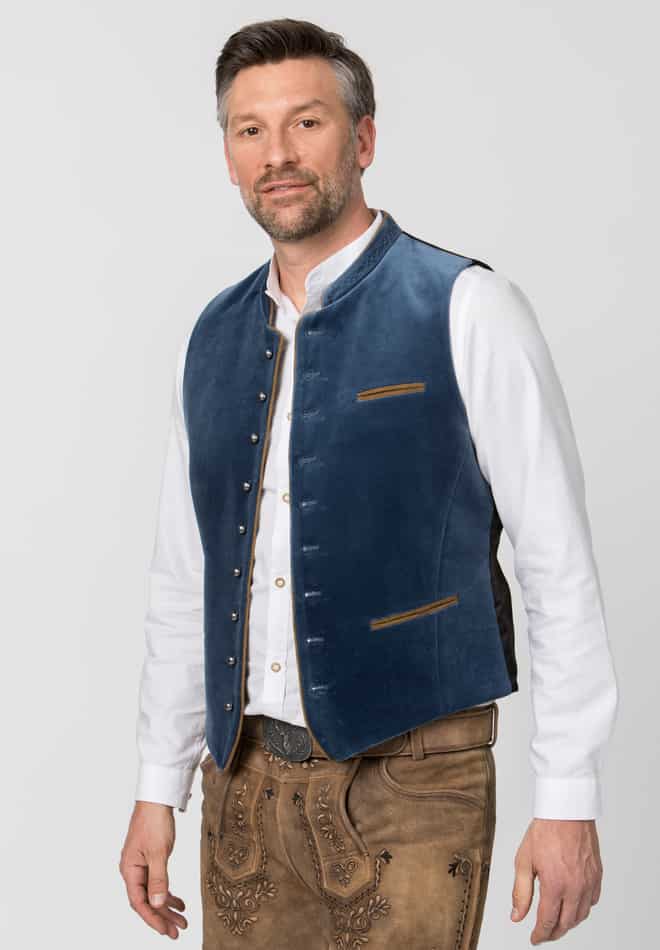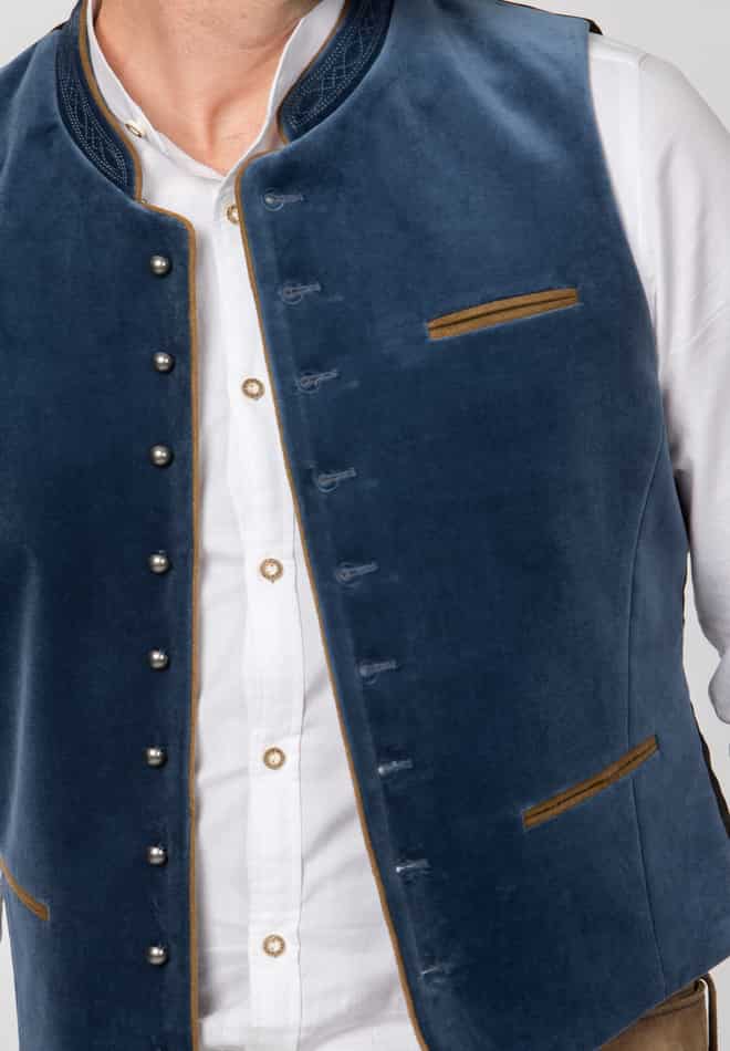 Trachtenweste Ricardo von Stockerpoint Classics. Die klassische Weste aus hochwertigem Baumwollsamt ist der Klassiker unter den Trachtenwesten. Die klassische, gerade Schnittführung garantiert eine sehr gute Passform und einen angenehmen Tragekomfort. Farblich abgestimmter Stehkragen und Paspel unterstreichen das traditionelle Design. Der Rücken ist aus schwarzem Satinstoff und lässt sich mit einem Riegel verstellen. Kugelknöpfe aus altsilber runden das edle Erscheinungsbild gekonnt ab. Die Trachtenweste ist der ideale Kombipartner zu unseren traditionellen Trachtenhemden und Lederhosen.